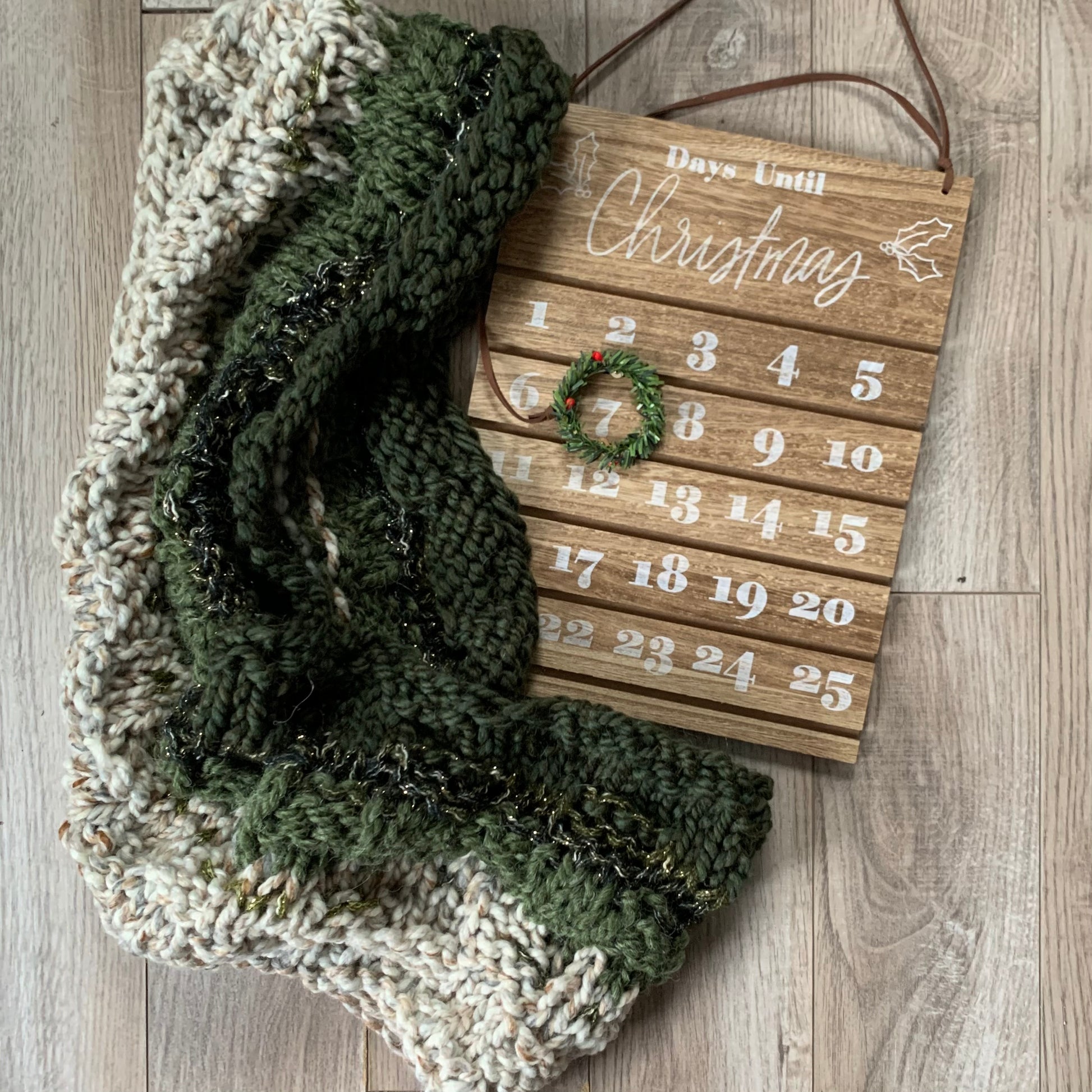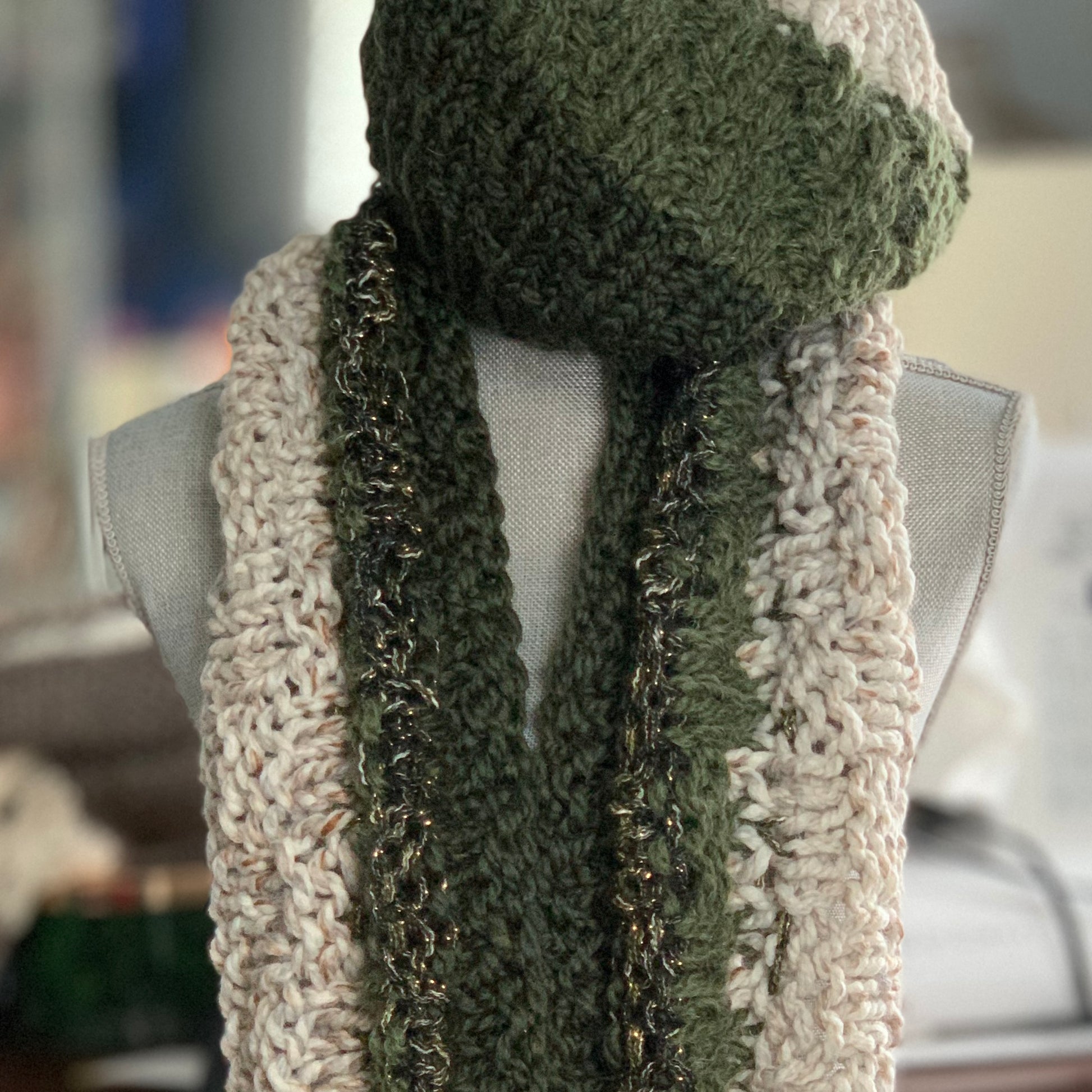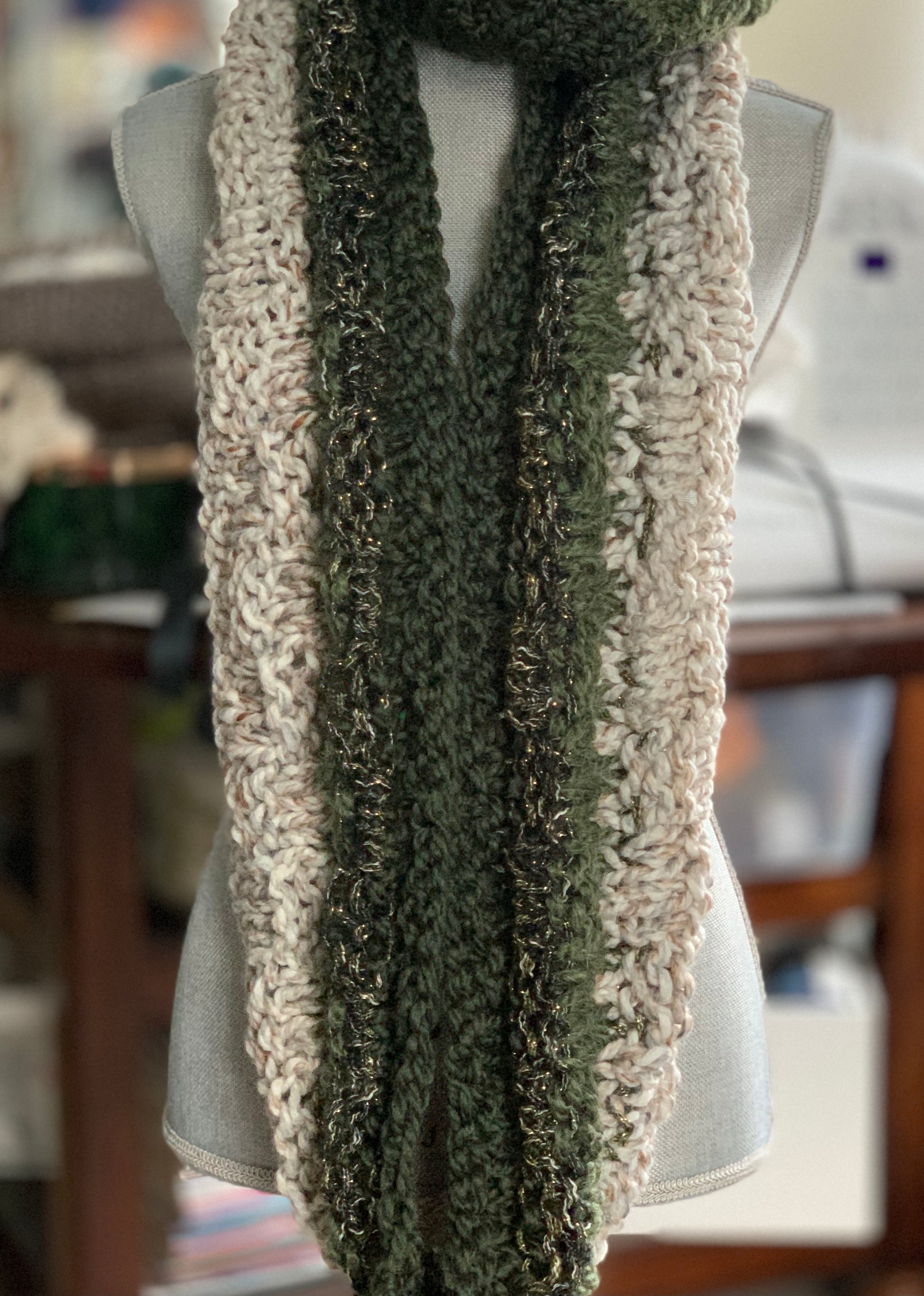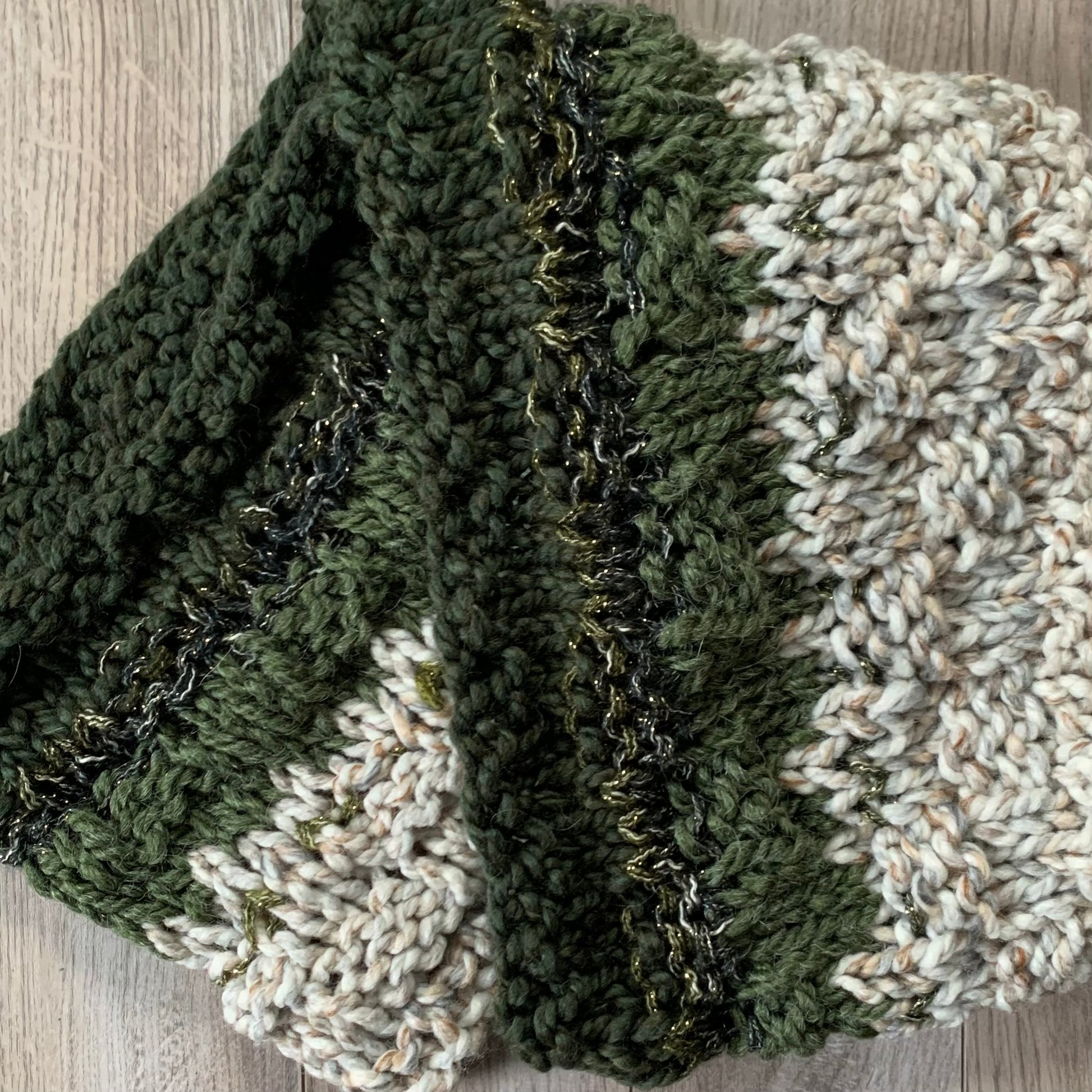 - beautiful hand knit infinity scarf in shades of green & oatmeal with a green & gold metallic accent yarn