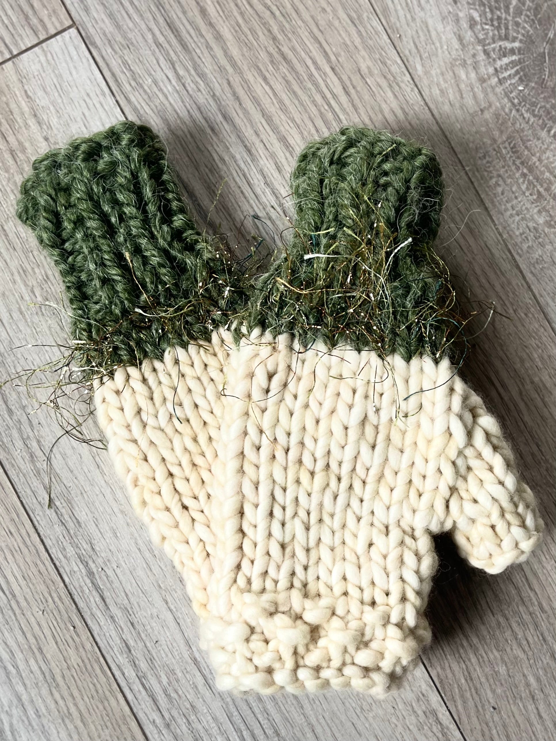 - beautiful dark green and cream with gold metallic eyelash yarn accent at wrist