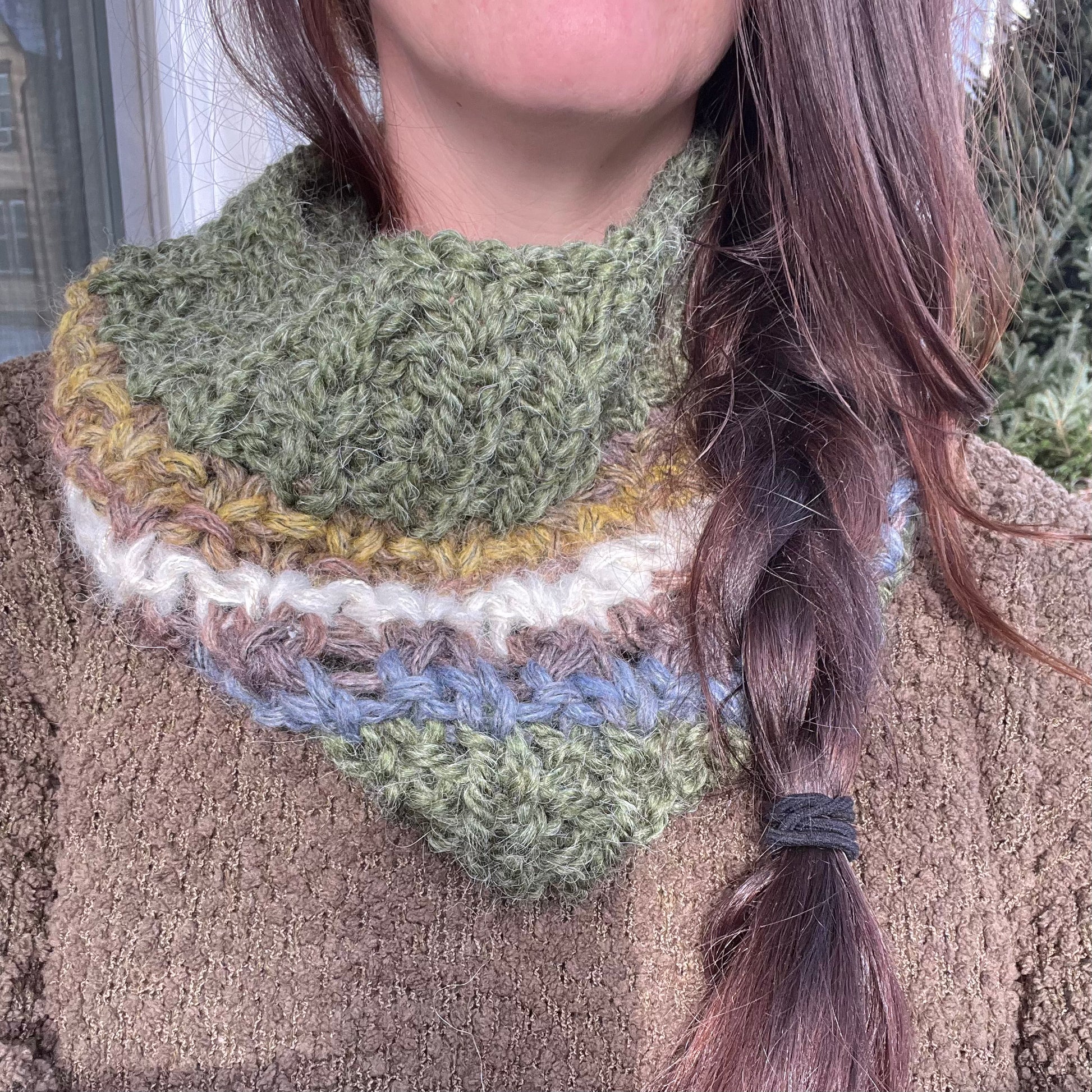 Hand Knit Cowl, Green & Multi Color yarns