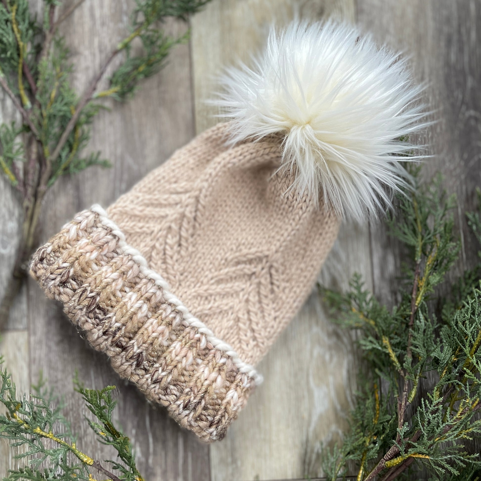 Hand Knit Winter Hat, Baby Alpaca, Tree Design with Faux Fur Pom Pom