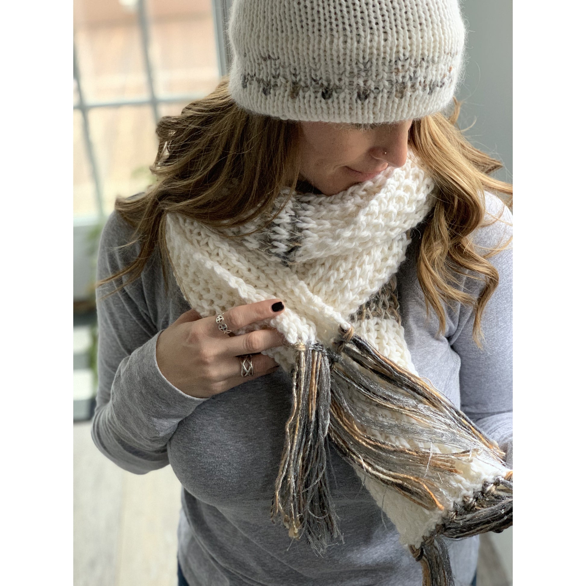 - hand knit scarf using baby alpaca yarn and mohair thread that make this scarf over the top soft