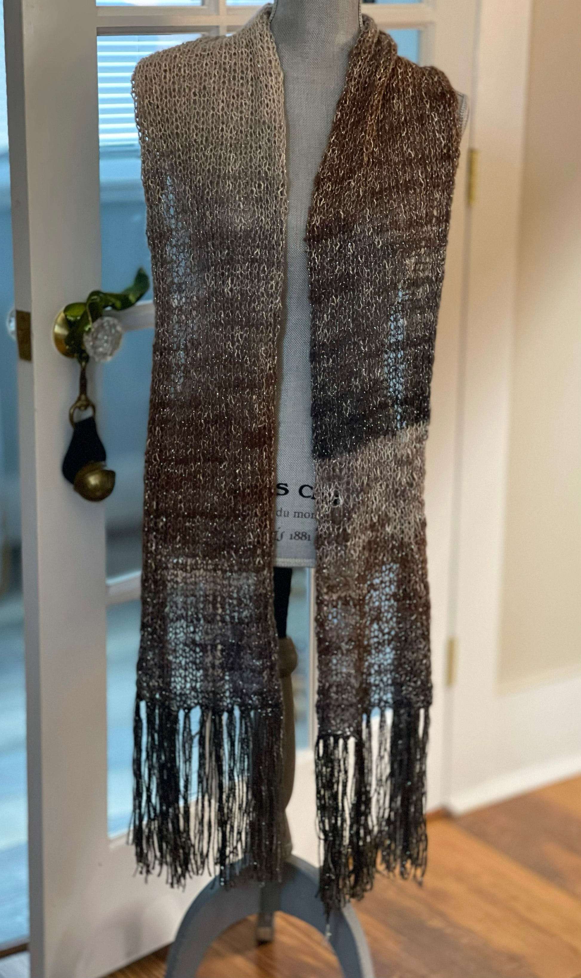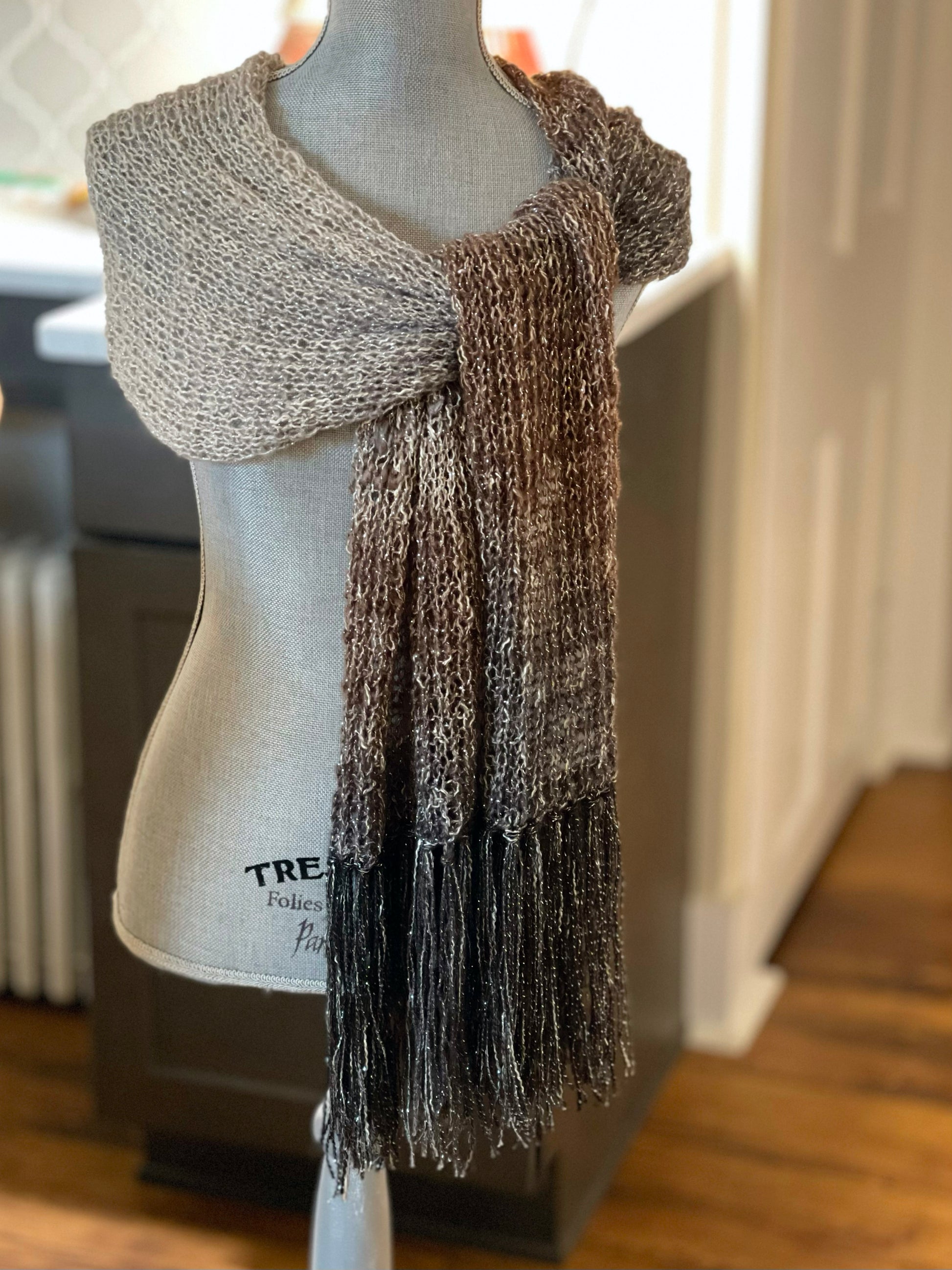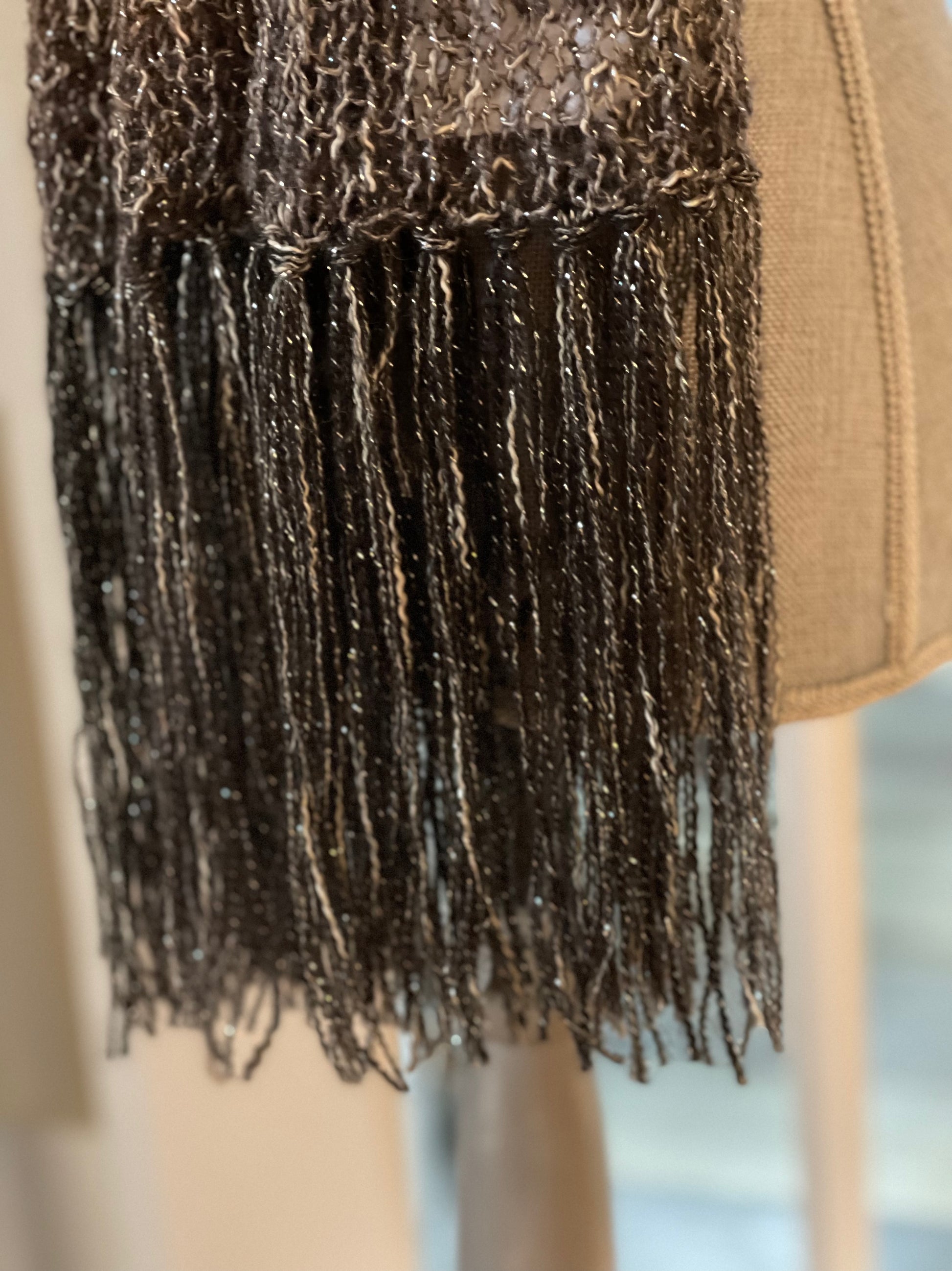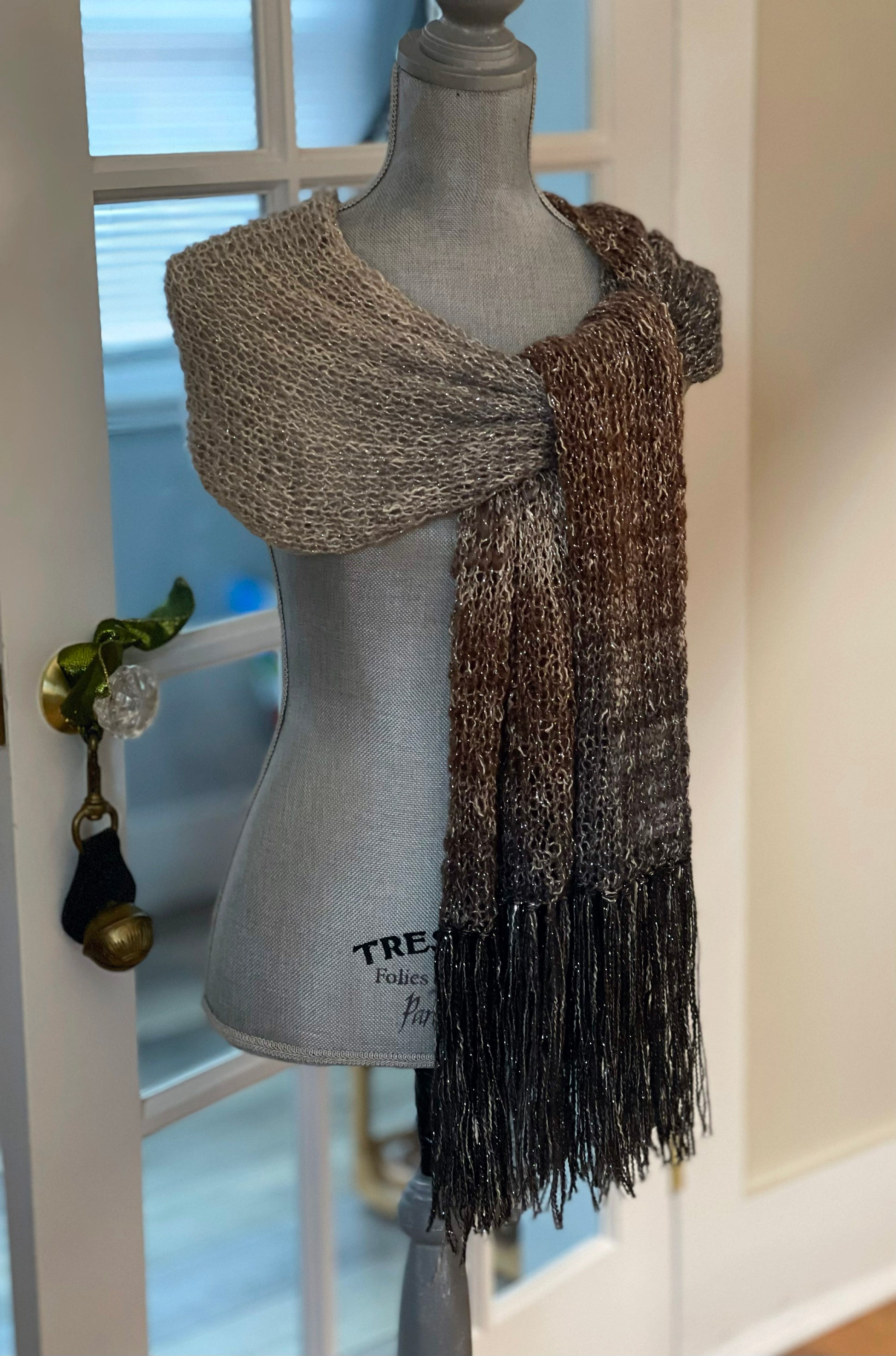 - expertly crafted luxurious hand knit scarf or shawl is a must have accessory. The shimmery sparkle adds a touch or elegance, while the long fringe is a stylish touch. Perfect for any occasion.