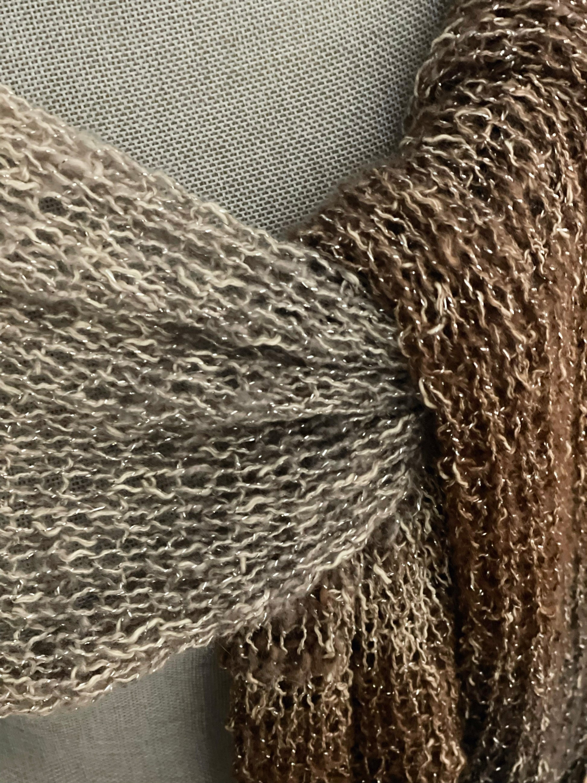 - yarn is tan to chocolate brown with a silver sparkle thread throughout