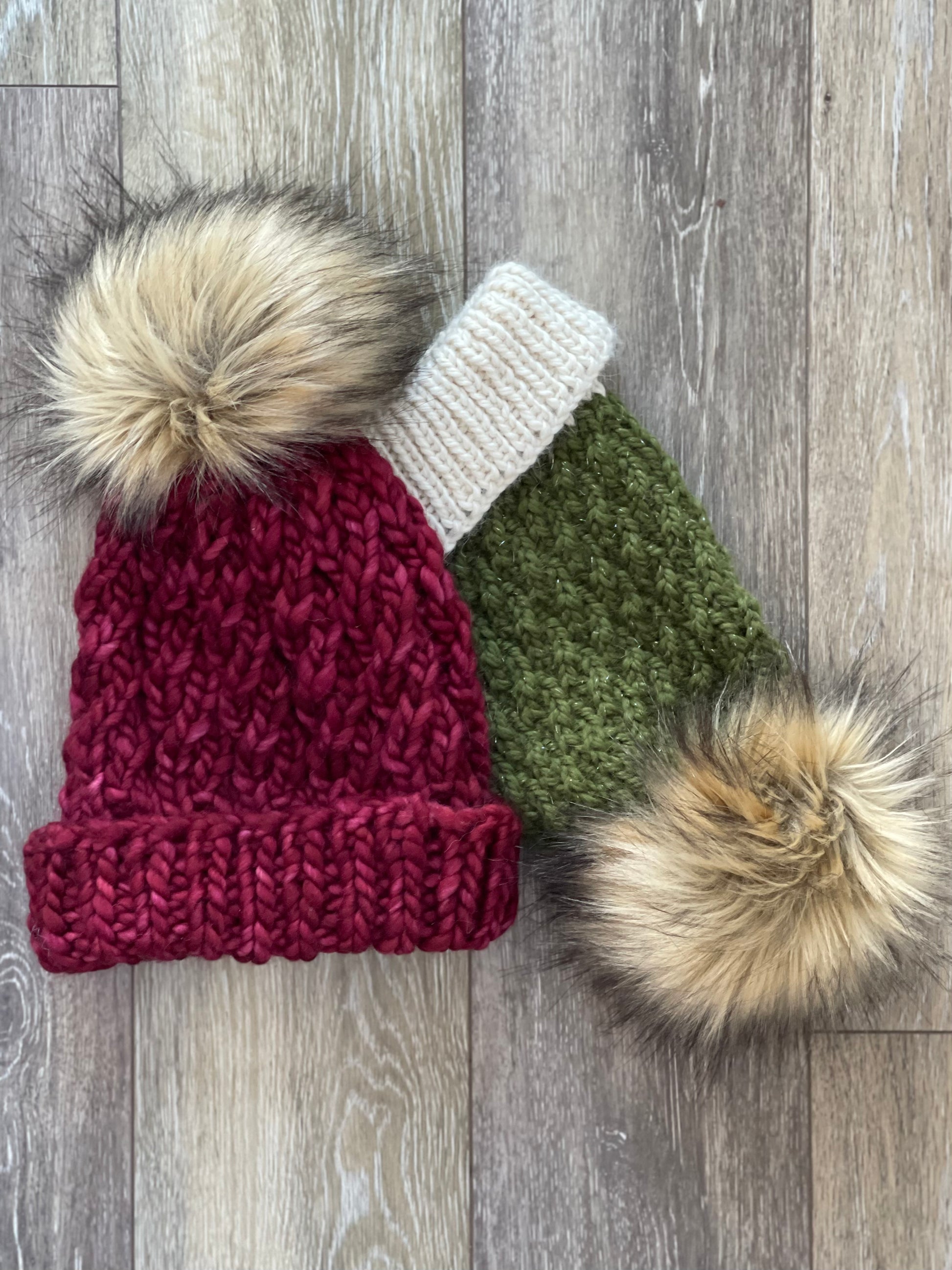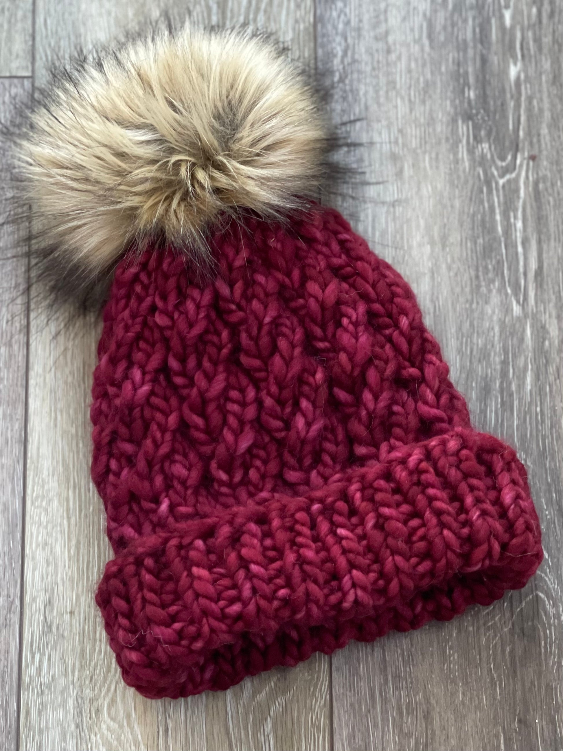 Handknit Winter Hat, Cranberry Twist, Faux Fur Pom Pom