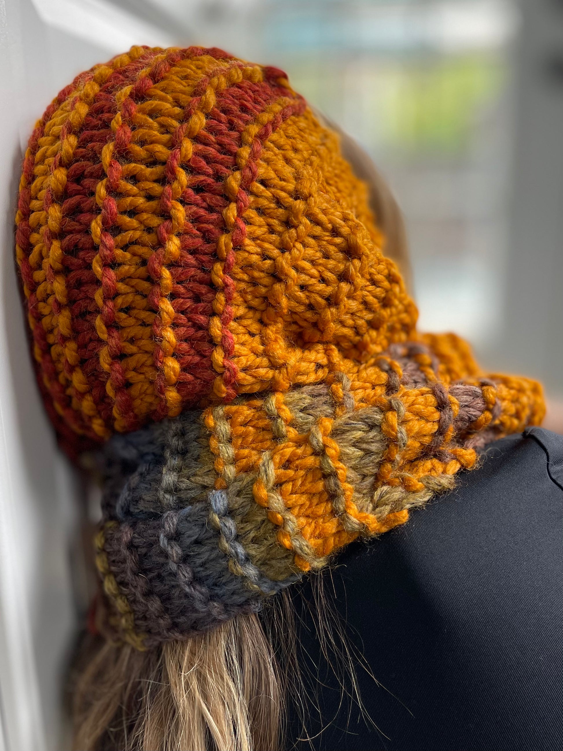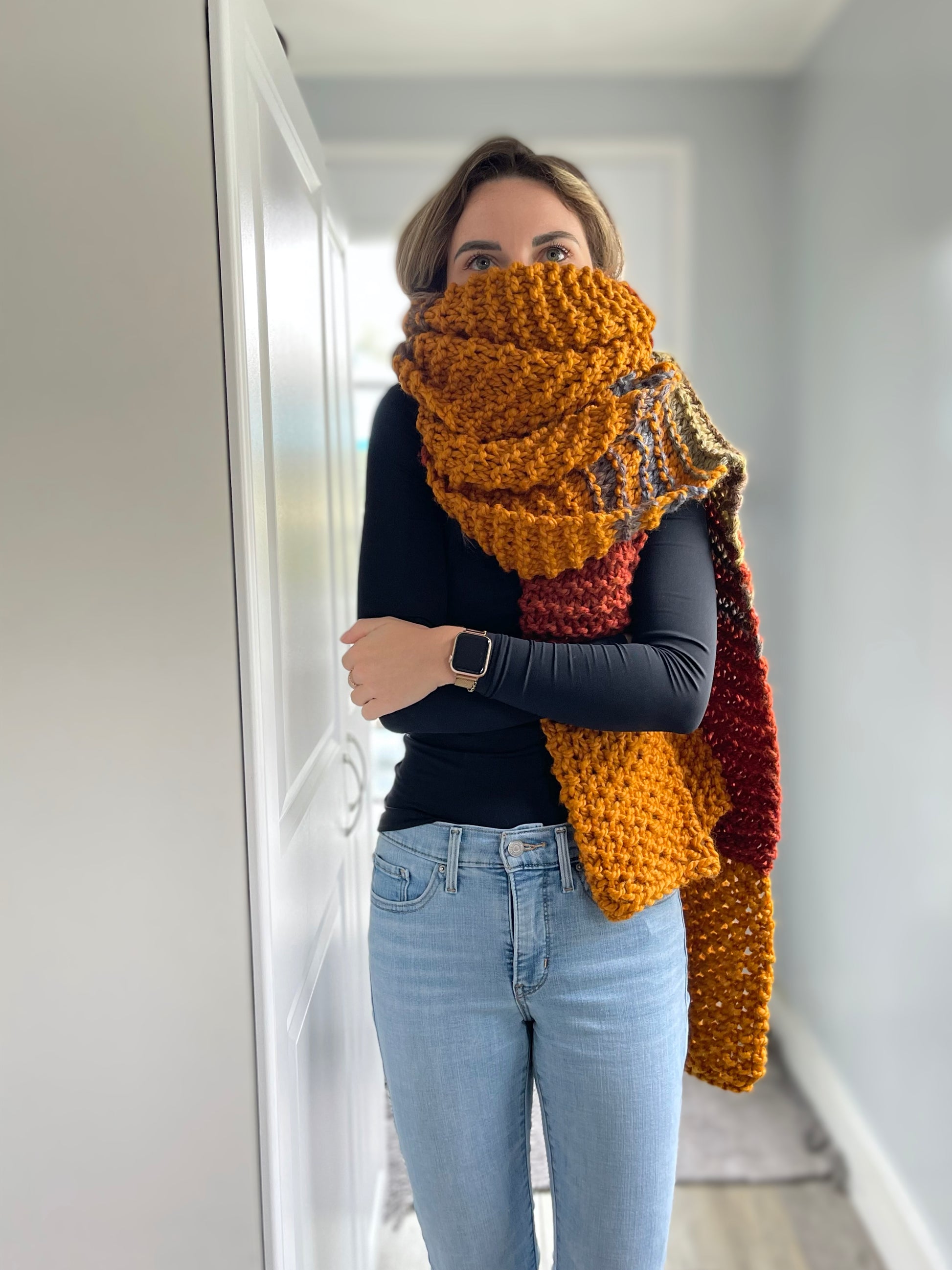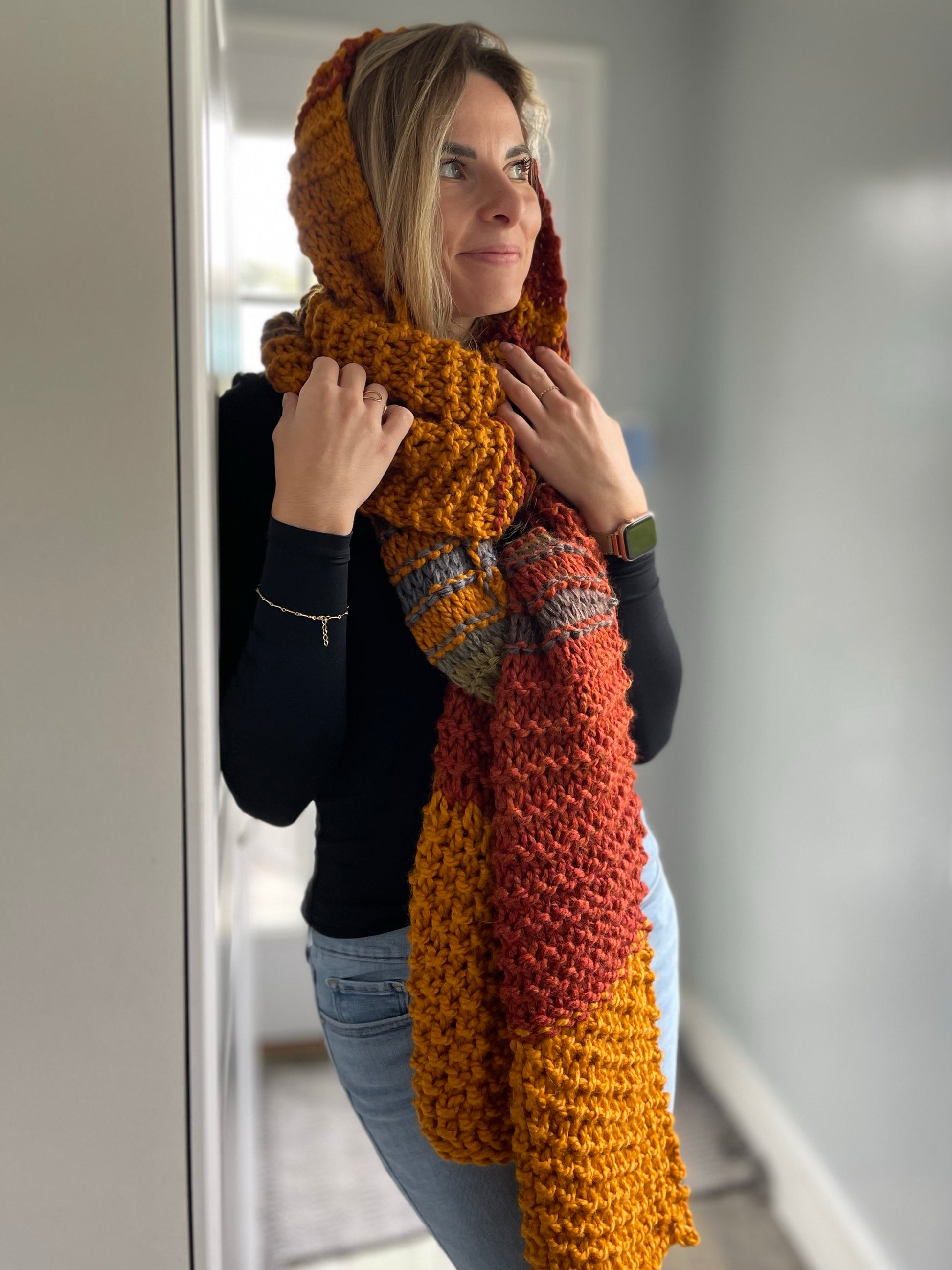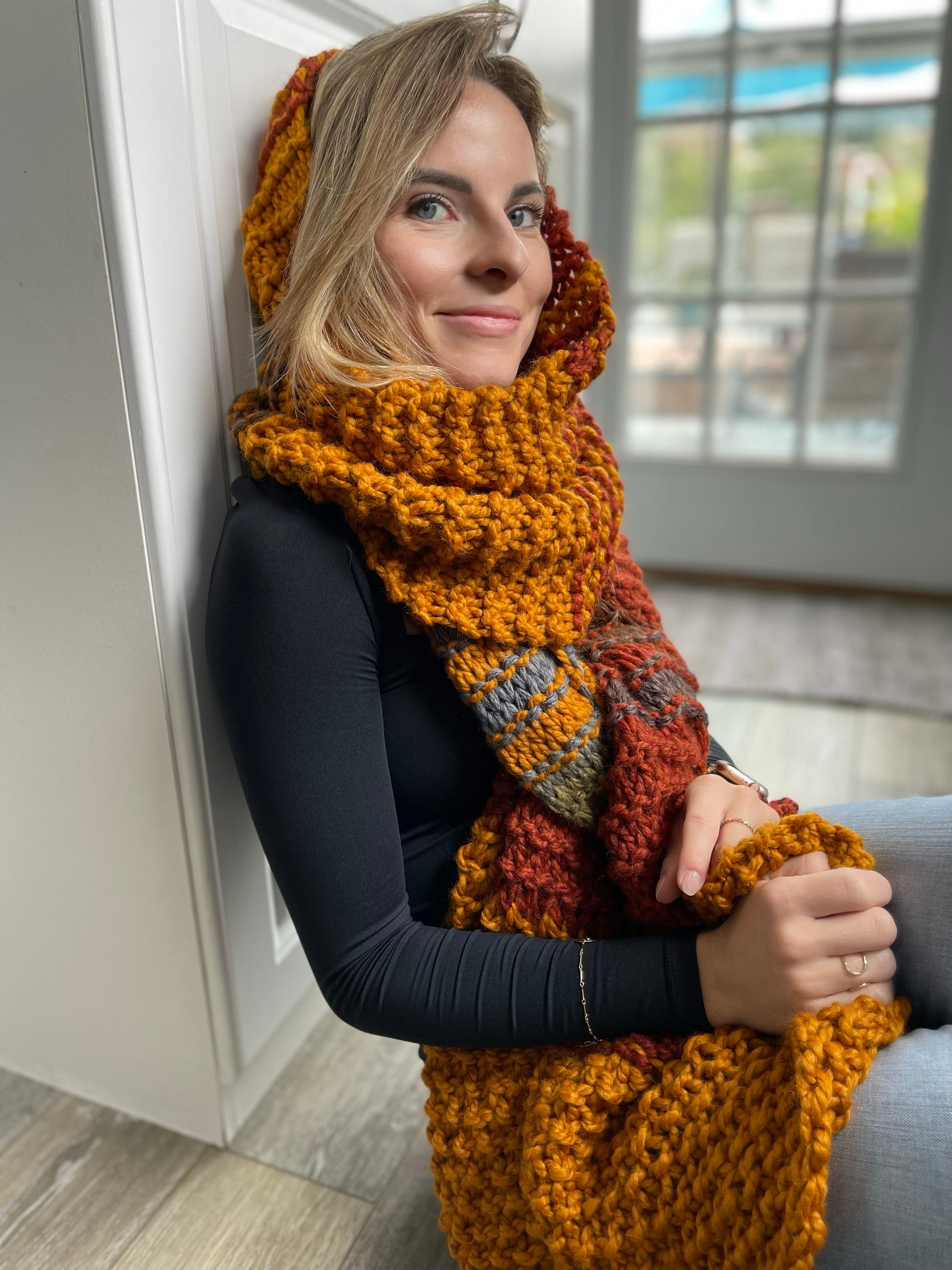 - hand knit winter scarf, extra extra long can be worn as a hood and scarf or wrapped several times around