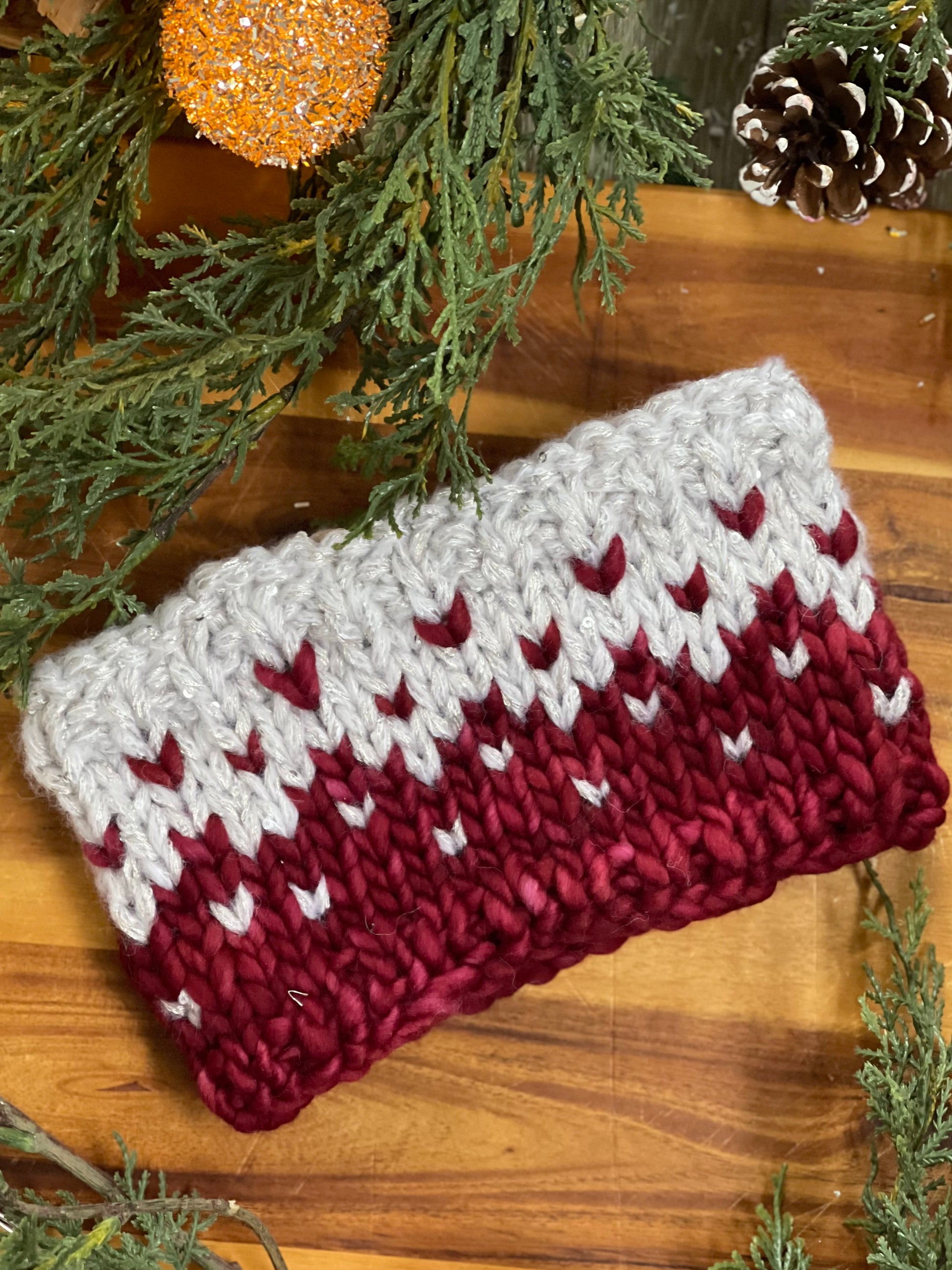 Winter Headband, Hand Knit, Cranberry and Silver Sequin Fair Isle