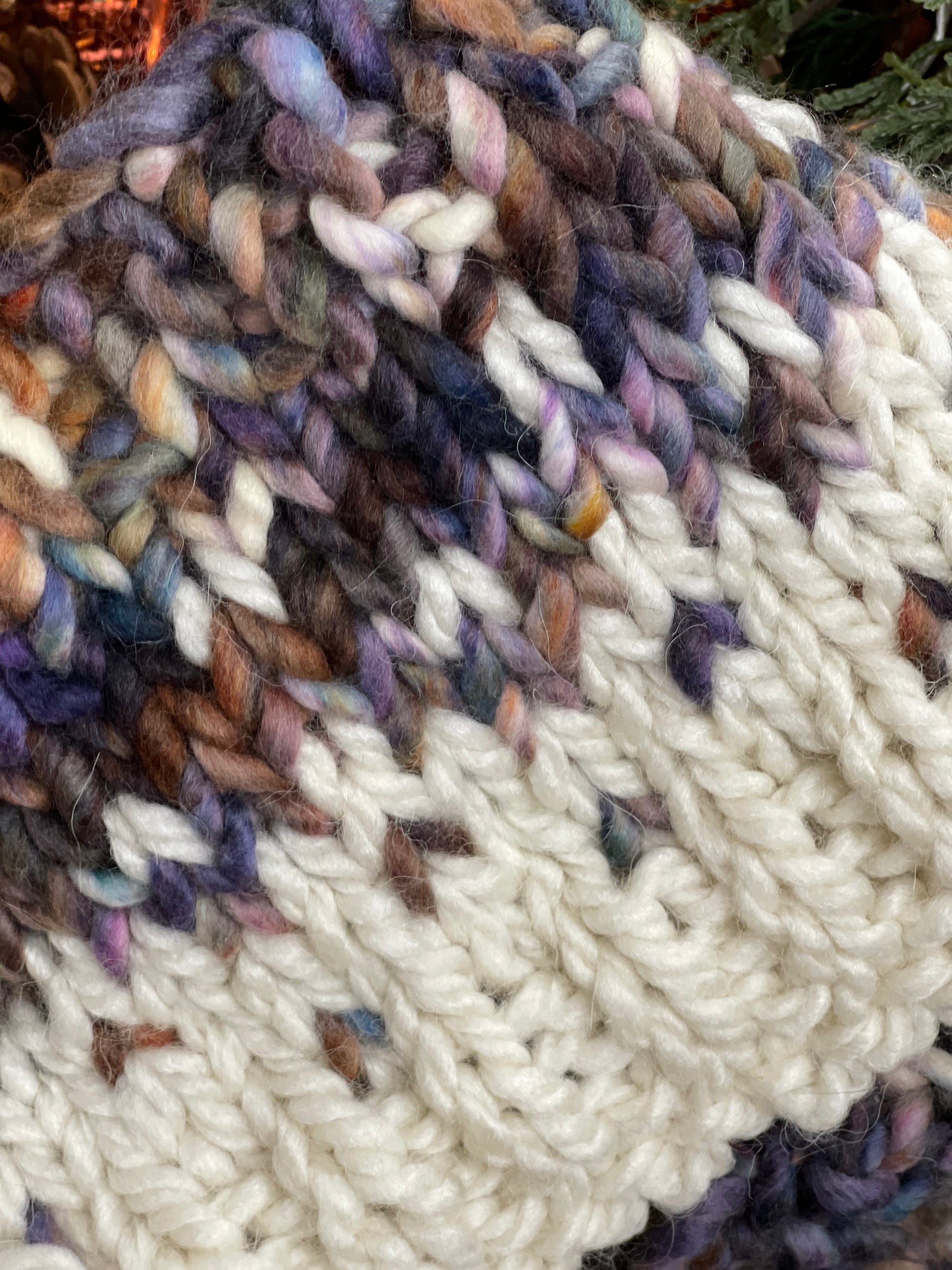 - purple variegated and ivory yarns knit in a beautiful fair isle pattern with rib knit borders